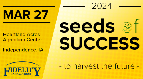 As Your Hometown Bank, we believe in agriculture as the industry to keep our economy growing strong. We’re proud to support our customers with educational opportunities to achieve their life-long goals and keep their operations moving. As part of this effort, we invite you to attend our FREE ag and estate planning seminar, Seeds of Success, on March 27, 2024 at Heartland Acres Agribition Center in Independence, IA.